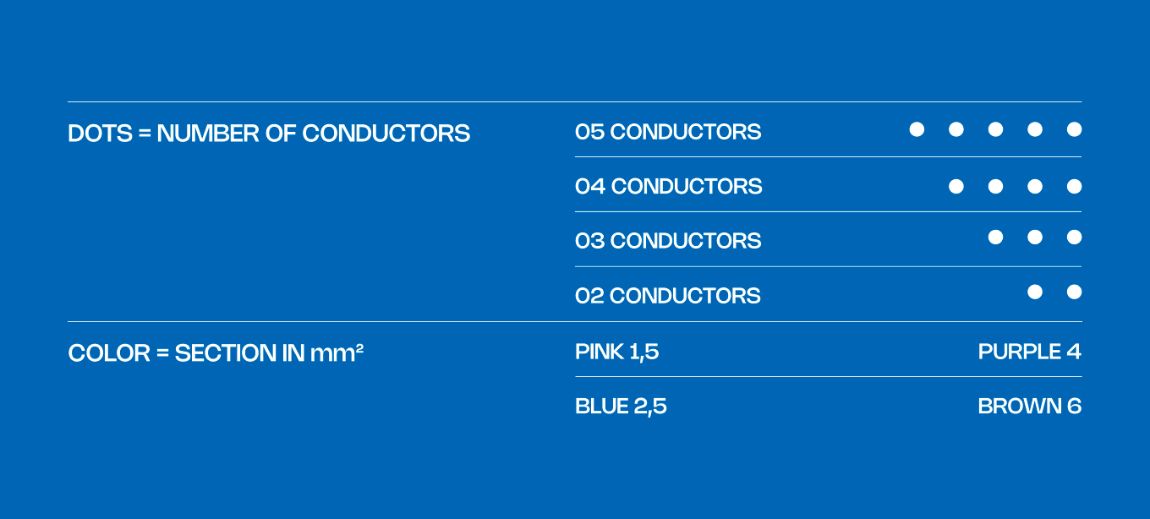 The number of dots printed on the sheath indicates how many conductors are present inside Klaro, while the colour identifies their cross-section.